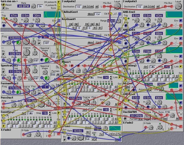 You can see by the mess of wires in this patch that noodles can be quite complex. In fact this noodle patch is one of the simpler ones out there. Most are even more complex. Even so, the best way to learn how to create your own noodles is to look at other people's noodle and see how they do it. Because of their complexity it can be difficult to understand what is going on. You should try to focus on the control signal structure and see what is modulating what. Also look for feedback, as this can also significantly affect the temporal variations. The sound generation chain itself is not so important from the perspective of the noodle maker.