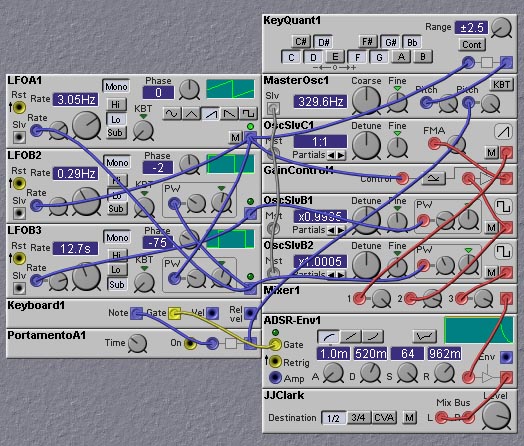 First off, you should decide what sort of noodle you want to create. That is, do you want a melodic noodle? Do you want a rythmic noodle? Do you want a timbral noodle? A combination of these? None of the above? This will tell you what type of parameters will be time-varying. Time-variation is the key in cooking noodles. As Jan Punter, one of the master noodle chefs for the Nord Modular, says, noodle makers should concentrate on the "blue wires" in the Nord Modular patch. That is, the control structures are paramount. The actual sound generation is less important, although of course you do want to have interesting sounds for the most part.
