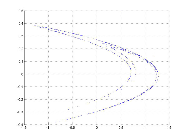 The following patch implements another type of Chaotic system, this one termed the Henon strange attractor. This system was discovered by the French astronomer Michel Henon while studying the dynamics of stars moving within galaxies. The equations for this system are:
