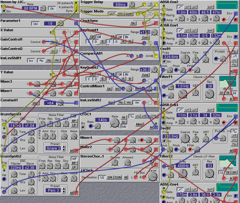 Some slow variation is possible by working with the audio-chain as well. Feedback, as we have seen in the case of three coupled oscillators, can give rise to chaotic behavior. This is not limited to feedback to frequency modulation inputs, however. Chaotic and unpredictable behaviour can result from all sorts of feedback, whether it be amplitude modulation feedback, filter cutoff modulation, etc. Especially good for creating unpredictable havoc are the delay module (inserted into feedback paths or use feedback to control delay times) and feedback of audio signals to sync inputs on oscillators. These provide very interesting timbral variations that seem to occur in bursts.