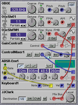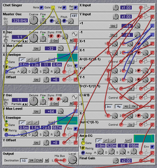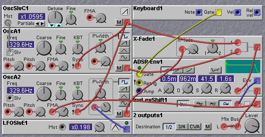 For the technical minded among you, there are some ways to make sync patches sound even better. The NM, as we all know, is a digital system at heart, even though it might sound "analog" from time to time. Because of the finite sampling rate used in the NM, the syncing waveform is actually quantized in time. This means that the synced oscillator is not only synced to the syncing waveform but also to the sampling clock. At low frequencies of the syncing waveform the effect of the sampling clock sync will not be too noticeable, but at high frequencies it becomes quite significant. Rob Hordijk suggests a way to remedy this problem. The jitter caused by the syncing to the sampling clock is most noticeable at the transient that inevitably appears at the point where the syncing signal causes the synced waveform to switch. One can apply a mask, or envelope, over the synced oscillator waveform, to suppress this transient. A simple way to do this is to use a downward sawtooth as the syncing waveform and also use it as an amplitude envelope that modulates the synced waveform. This has the drawback of distorting the synced waveform, of course. An improvement can be had by crossfading two such synced waveforms, each out of phase with respect to each other. This will minimize the distorting effect of the masking. The following patch by Rob Hordijk illustrates the approach.