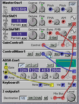 The following patch shows a three-stage FM chain. The sound is more lively