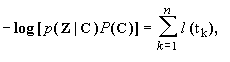 proportional to -log [p(Z|C)+P(C)]. Since log() is a monotonic function and there is a one-to-one correspondence between paths and sequences, we only need to find the path whose -log [p(Z|C)+P(C)] is minimum, this will give us the state sequence for which p(Z|C) P(C) is maximum, in other words, the state sequence with the maximum a posteriori (MAP) probability, which take us back to the original problem we want to solve. The total length of the path corresponding to some state sequence C is