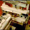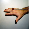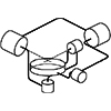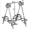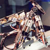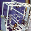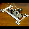 This machine (never named) was built in 1991 out of scavenged disk drive actuators (thanks Hewlett Packard for a large box of out-of-specs drives!) capable of creating 6 DOF tactile stimuli to the fingers of a subject from DC to 500 Hz. The basic design idea is the handle held inside a cage that allows 12 tendons to act on it in a "cubic" configuration and which has the intertial tensor of a sphere. Thus, the response is guaranteed to be the same along and around all axes. The tendons were made of Spectra(TM) which provided large bandwidth response (results were obtained from experimentation with it, but none are published).