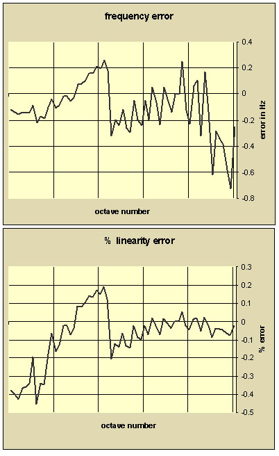 The VCO is fairly linear. As the graphs below show, the linearity error is less than 0.2% over most of a 5 octave range from 30 to 960 Hz (and actually is that good over a 7 octave range). The frequency error is mostly less than 0.2 Hz over this range, with an increase to 0.6 Hz error at higher frequencies (the frequency error will give the beat frequency with an exact oscillator).