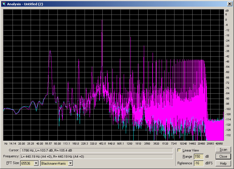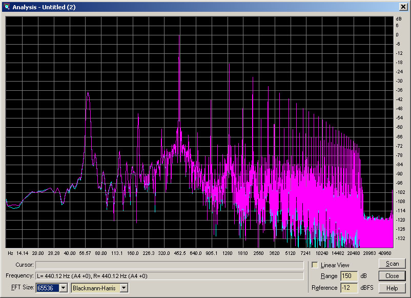 To get an idea of the comparative quality of the 2207 triangle waveform with the Doepfer A-110 VCO triangle waveform, look at the spectrum plots shown below. These plots were produced by the CoolEdit program on a 60-second sample of a 440Hz triangle waveform, with a sampling rate of 48,000 samples/per second in an Event Gina 20-bit sound card. It can be seen that the harmonics of the 2207 triangle fall smoothly out to the limits of the sampling rate of the soundcard, whereas the harmonics of the A-110 VCO stop falling in amplitude around 3620 Hz. There is a low-level Square-wave even harmonic sequence present, at about 36dB down (extrapolating the sequence back to the fundamental) from the Triangle wave odd-harmonic sequence. This might be leakage from the square wave output, or might be coming from the power supply lines in response to the different current draws on the alternate phases of the square wave. In both waveforms one can see a 60Hz (hum) component that is about 36 dB below the fundamental. This is probably from the power supply. My complete system was drawing approximately 645mA, which is close to the rated limit of the Doepfer power supply (650mA).