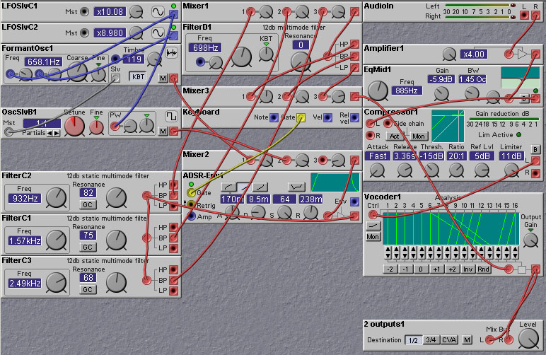 The Nord Modular vocoder module allows the remapping of analysis channels to synthesis channels. This warping of the frequency content of a sound can be used in many ways; one of the most interesting being its effect on percussive sounds (try it!). It can also be used to make a male voice sound more feminine as crossing over some of the higher frequency bands can simulate the differences in the resonant structures of the male and female vocal tract. This is demonstrated in the following patch by Tommi Lindell.