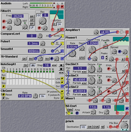 Pitch tracking can be used to control more than just the pitch of an oscillator. It can also be used to control filter cutoff, for example. Or even something non-frequency related, like the slope of an envelope generator attack (using a modulated enveloped generator module). The following two patches demonstrate such uses of a pitch track signal. The first uses the pitch track signal to control the cutoff frequency of a filter, the second to control the center frequency of a phaser module.
