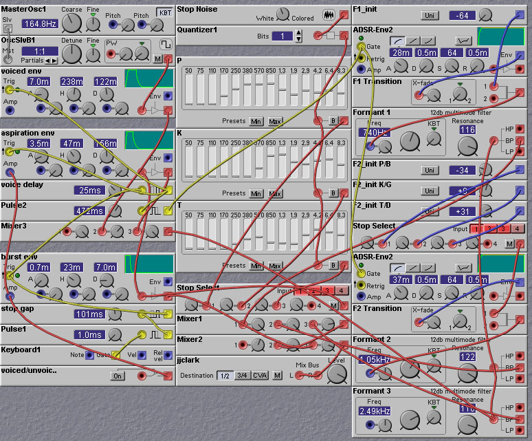 The following patch shows how unvoiced stops (as well as voiced stops) can be synthesized. Knob 1 selects the particular stop to be synthesized, and selects the appropriate noise spectrum and formant transition. Knob 2 switches between voiced and unvoiced synthesis, by gating in and out the unvoiced excitation.