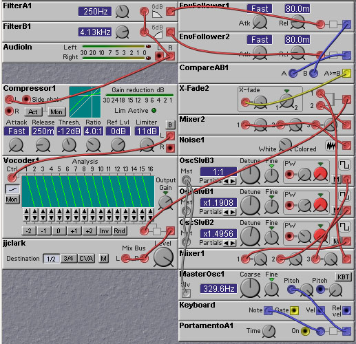 Note the use of a compressor in the above patch. This is a common technique used with vocoders, as it prevents the sound from becoming too "choppy" due to the relatively low amplitude of vocal sounds at the beginning and end of spoken words.