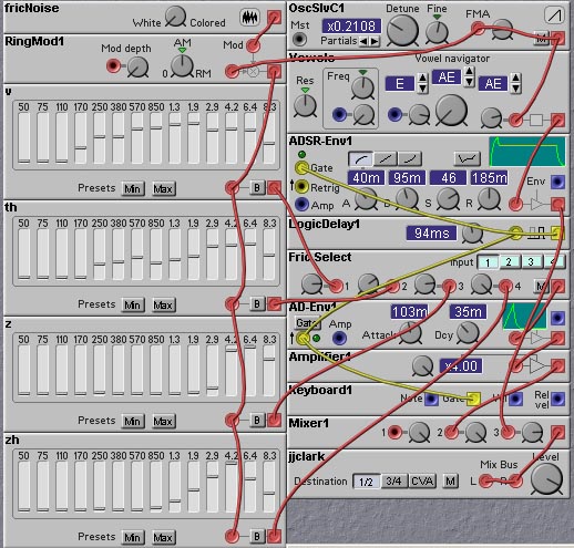 The patch shown in the following figure shows how unvoiced fricatives can be implemented on the Nord Modular. Filter banks are used to sculpture the required spectral characteristics which distinguish the various types of fricatives.